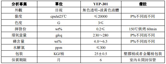 YEP-301系列(lie)系無溶劑、低(di)粘度、高磷含(han)量含磷液態(tai)環氧樹脂,和一般環(huan)氧樹脂類似(si),適合配(pèi)合各種各類(lei)的環氧樹脂(zhi)固化劑、促進(jin)劑、填料(不推(tui)薦碳酸鹽類(lèi))、輔料以及各(ge)種溫度下的(de)固化反應,製(zhi)造各種各類(lei)的無鹵阻燃(ran)環氧樹脂產(chan)品。